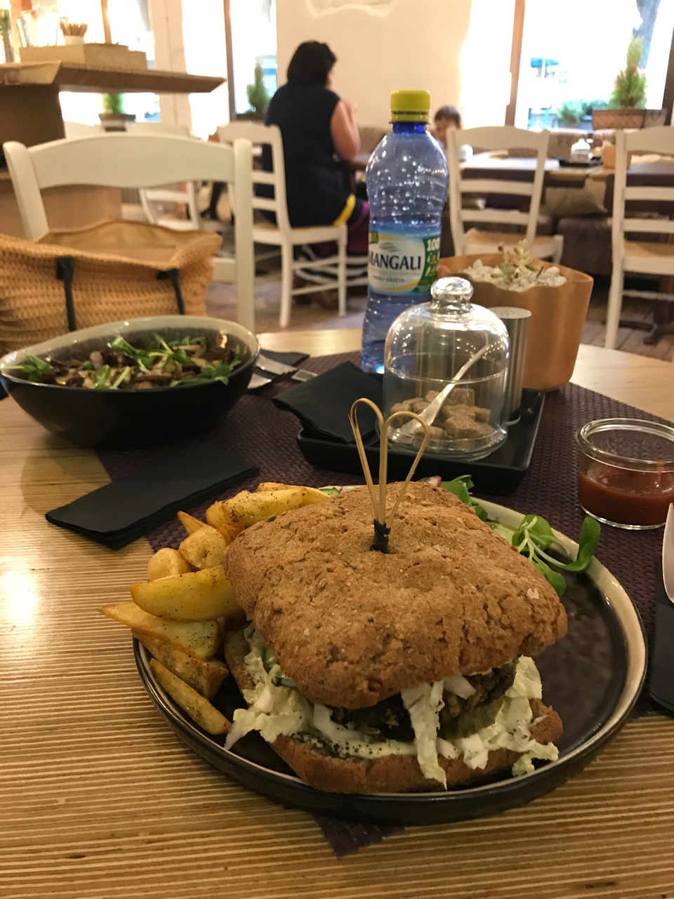 After the rain started, we moved our cumbersome luggage inside and finished our meal to the beat of some Hindu pop music. The portabella burger was fresh and delicious, and Rita had a pea salad that was also very good. Service was slow and deliberate, but maybe that was part of the charm. The waiter, Reinis, was joyful and kind. We recommend.