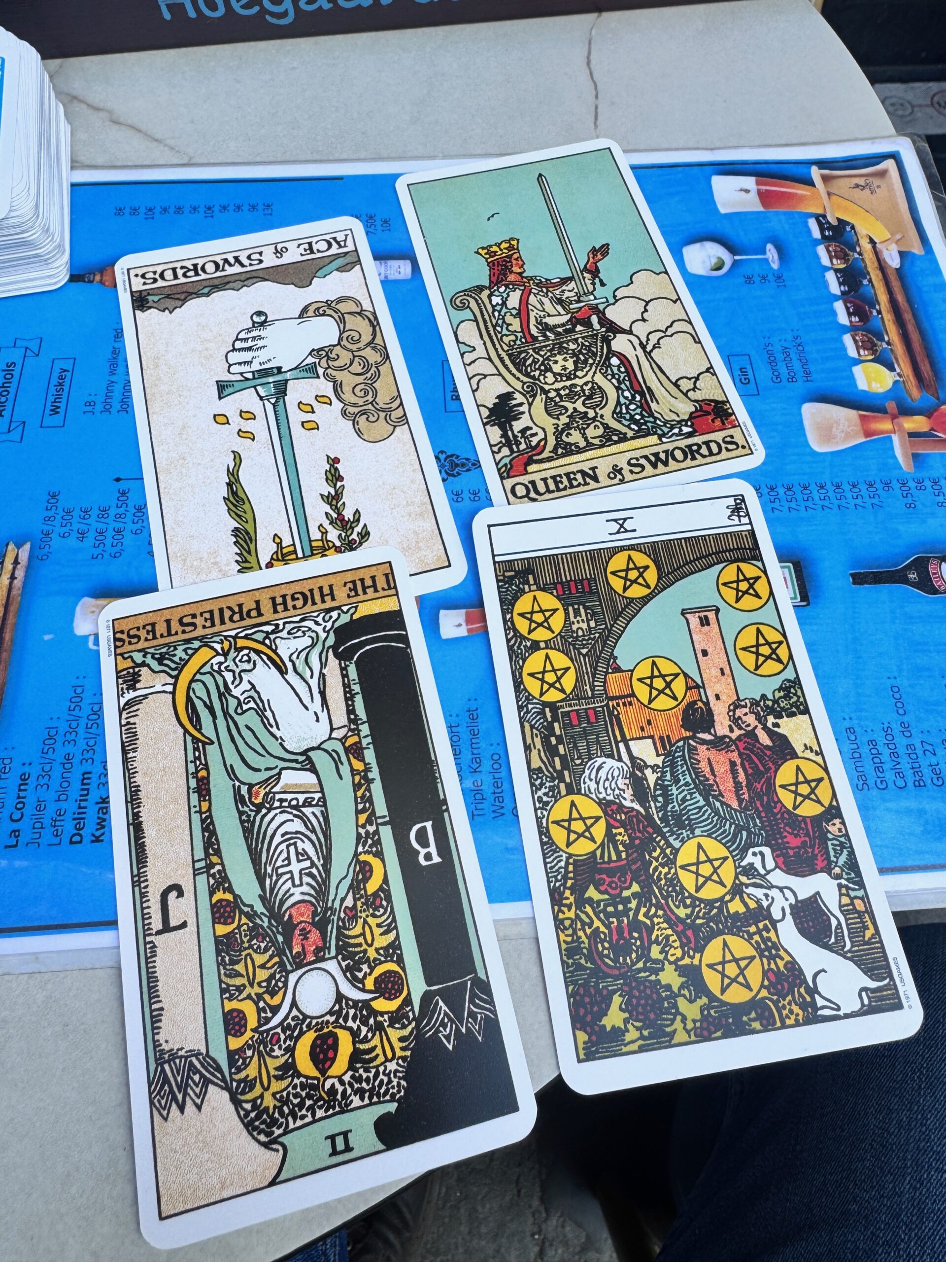 Our Greek waiter was very friendly. Because it was Sunday, Baiba and I indulged ourselves in our weekly tarot reading with the cards laid out on the small table. This drew the attention of some of the patrons. The waiter and his friend asked for a reading as did the Italian woman sitting next to us. I read their cards and made them all smile, which made for a wonderful end to the afternoon.